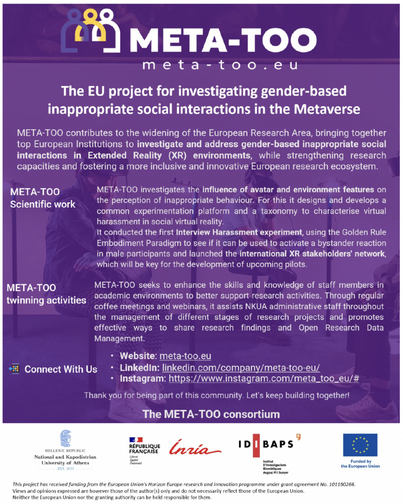 By connecting expertise across computer science, psychology, and ethics, META-TOO is building a stronger foundation for interdisciplinary research on user well-being in immersive environments. The project actively supports early-career researchers, enhances NKUA’s institutional role in European research, and promotes responsible innovation in the rapidly evolving Metaverse.